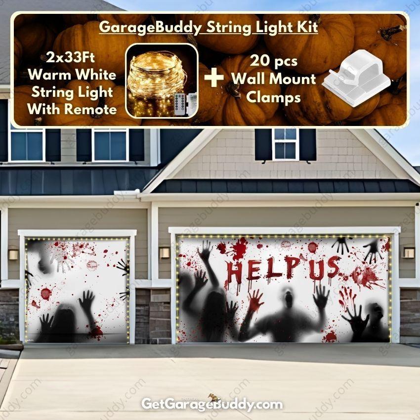 You now have the option to add the GarageBuddy string light kit to your order at 50% off and turn your garage into a true haunted showstopper. Pair your Halloween garage door cover with these glowing lights for the ultimate outdoor Halloween decoration. The kit includes 1x 33 ft warm white string light, a remote control, and 10x sticky wall mount clamps. The 2-door garage option comes with 2 string light kits. The lights work on three AA batteries (not included), so there's no need to worry about outlets.